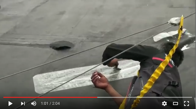 A Volvo 70 mainsail being patched with Dr. Sails while underway.